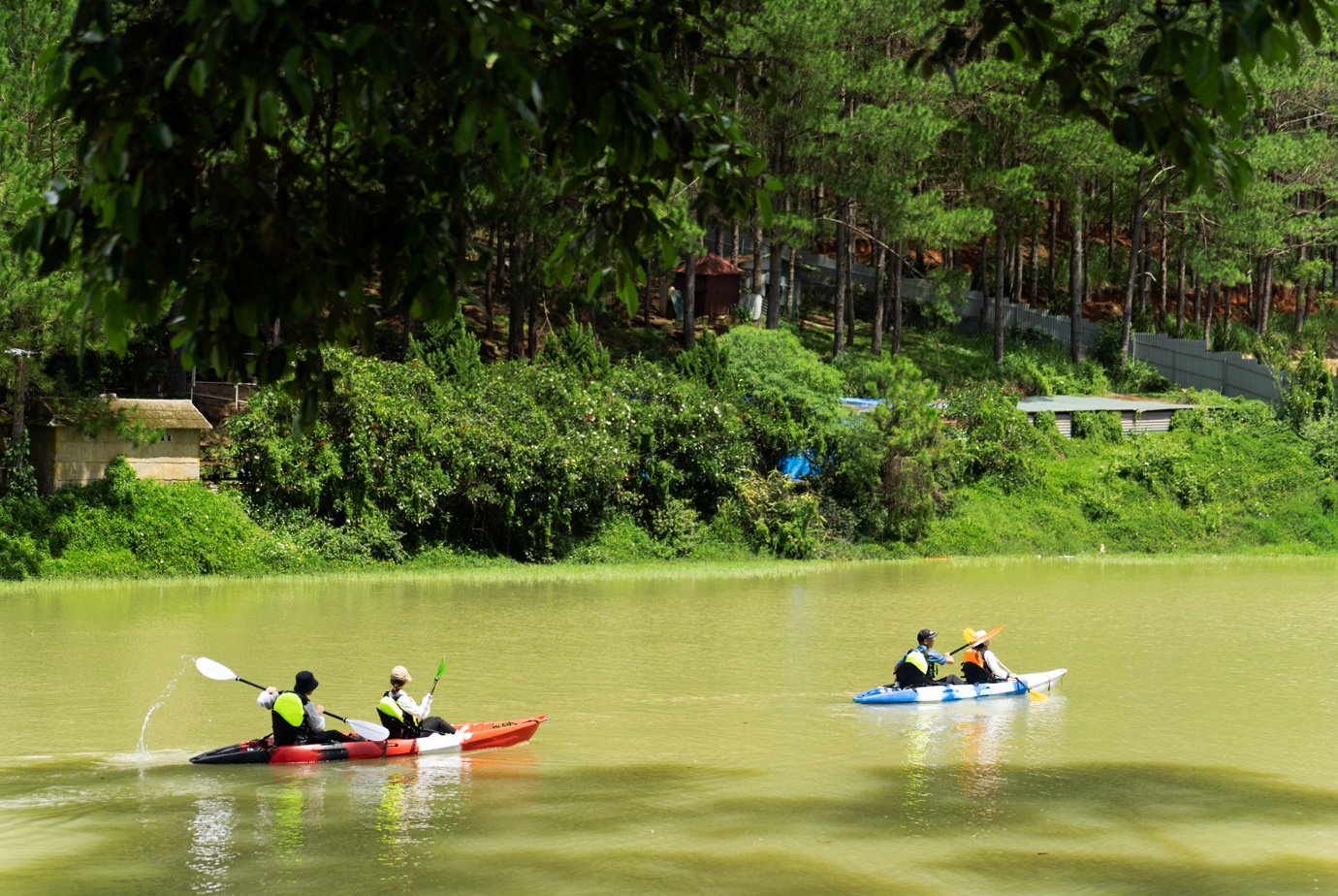 Lênh đênh trên mặt nước, nhìn ngắm cảnh vật thiên nhiên rừng thông, hoa lá xung quanh hài hòa, cảm nhận được sự yên bình trong tâm hồn và có được những phút giây thoải mái, thư giãn sau những ngày làm việc căng thẳng.